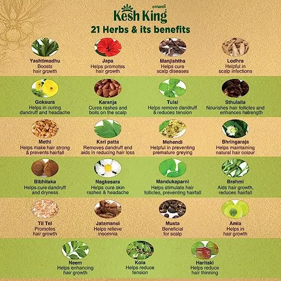 - Contains the goodness of 21 Ayurvedic herbs like Bhringraja, Amalaki, Methi, Brahmi, Japa, Lodhra, Manjistha, Jatamansi